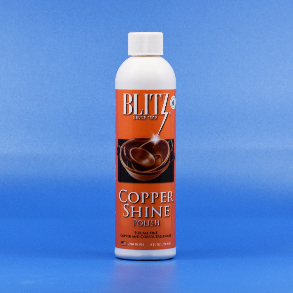 Copper Shine Polish cleans and restores the original brilliance to copper and copper tableware. This product contains no alcohol, no ammonia, no acids, no V.O.C. and no abrasives. According to the Jeffrey Herman Silver Restoration & Conservation Copper Polish Abrasion Rating, Blitz® Copper Shine Copper Polish was rated 1 out of 3 (1 being least abrasive, 3 being most abrasive)