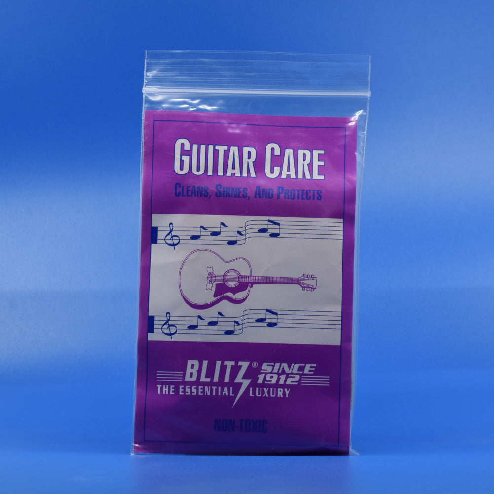 Created by Blitz for the care of the finest, most delicate surfaces. For all guitars. One of the few cleaning cloths that contain both natural carnauba and natural beeswax, with just enough silicone added to assure even distribution of these natural, renewable waxes. Perfect for waxed wood finishes, lacquered wooden surfaces, or even polymer (fiberglass, or wood-polymer composite) surfaces. We suggest you have one cloth for each of your guitars so you can use it after each session.